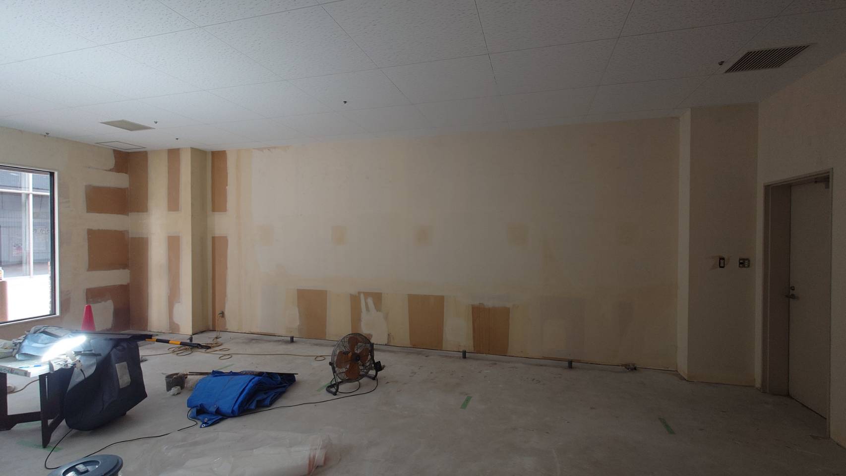 施工前に現地の状態を詳しく調査し、壁面の状態、面積、必要な材料を確認します。施工開始前には、床や建具、設備などをしっかりと養生し、汚れや傷がつかないよう保護いたします。